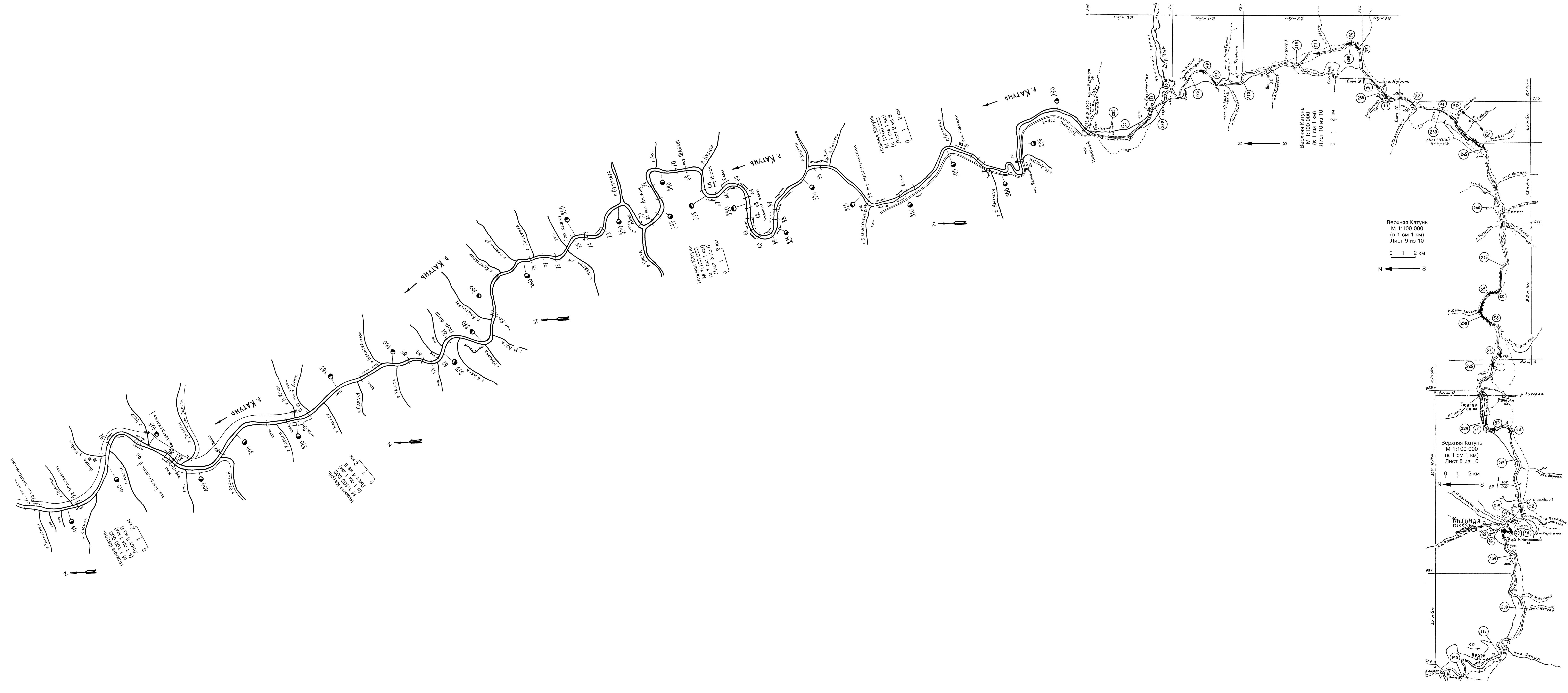 Дошли до русла сухого ручья Уйген, выползли по нему на перевал, после чего спустились обратно к Катуни, построили вновь катамаран и понеслилсь вперед. Впадения ручья Бим-Бом не заметили, пронеслись мимо.. Вода (68-70) - мощный сжатый поток с редкими гребнями валов 1,2-1,5 метра. Препядствия 71, 72 шиверы с нагромождением валов до 1,5 метров. Попадаются большие обливные камни и бочки. Прошли походным порядком. В 72м неприятно свалились с обливного камня - похрустели рамой и поплыли дальше. 73 последняя шивера перед Кафе Аргут. Валы от 0,7 до 1,0 метров.
