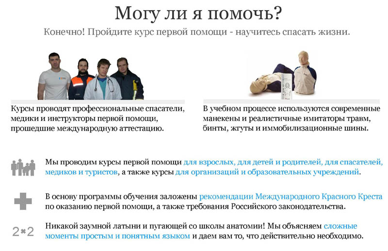 В основе курса заложены алгоритмы действий при попадании в ЧС и обнаружении пострадавшего. Вы научитесь правильно оценивать собственное психологическое состояние и состояние пострадавшего. Вас обучат конкретным действиям, которые помогут не растеряться в ЧС. Помимо теоретических знаний, приобретаются и оттачиваются практические навыки, отрабатываемые на современных манекенах. На занятиях моделируются и разбираются многочисленные ситуации из реальной жизни. В конце курса проводятся ситуационно-ролевые игры. Выдается сертификат российского образца или международный сертификат.