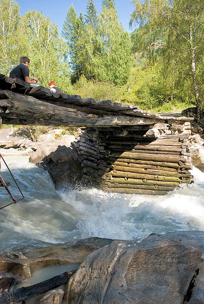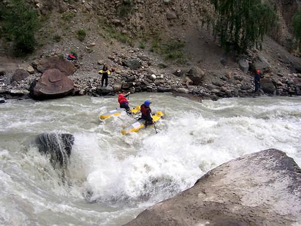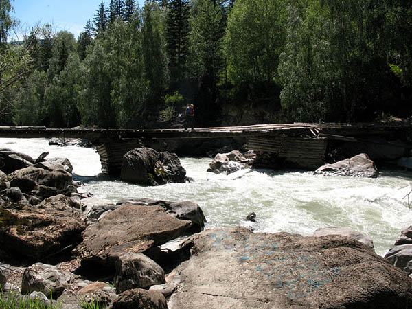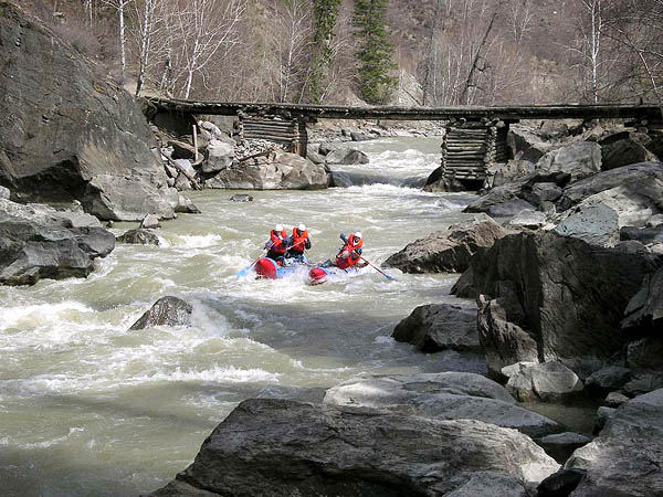 Порог Бегемот V к.с. - начинается через 500м после устья правого притока Айгулак. Чалка к левому берегу перед мостом. Бегемот - одно из сложнейших препятствий нижней Чуи, имеет мощные сливы, бочки, бушующие валы высотой до 2м. Длина 400м Условно порог можно разбить на 7 ступеней. Наиболее опасны 1,3,4. Первый слив находится между опорами моста. Высота слива 1,5м за ним такой же стоячий вал. 2-й слив проще, но за ним тоже высокий вал. На 3-й ступени в сливе "зуб" на который несет основная струя. За сливом несколько подводных плит, валы 1,5м бочки 1,5м.