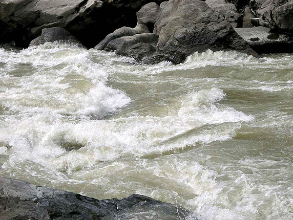 За первыми двумя сливами торчат "зубья"(при определенном уровне воды напоминающие морды бегемотов). Вода кипит на первых трех ступенях. 4-я ступень - мощный слив с закрученным валом. 5-я - прямой слив. 6-я - слив с пульсирующими валами на выходе. 7-я - самая простая - шиверистый участок длиной 50м. Просмотр и места страховки на левом берегу. Обнос по дороге на правом берегу либо проводка вдоль левого. Вопрос о прохождении решается после тщательного просмотра самого порога и 7 мемориальных табличек на разных ступенях.