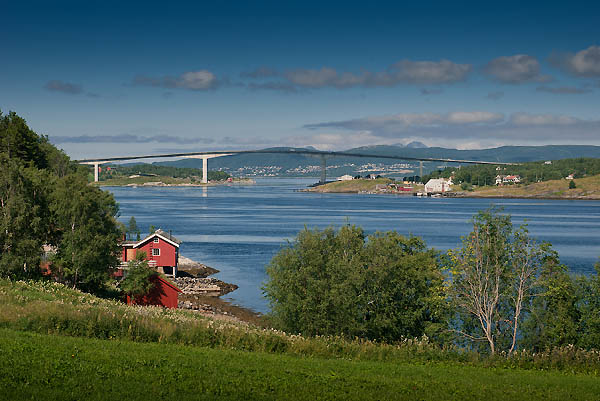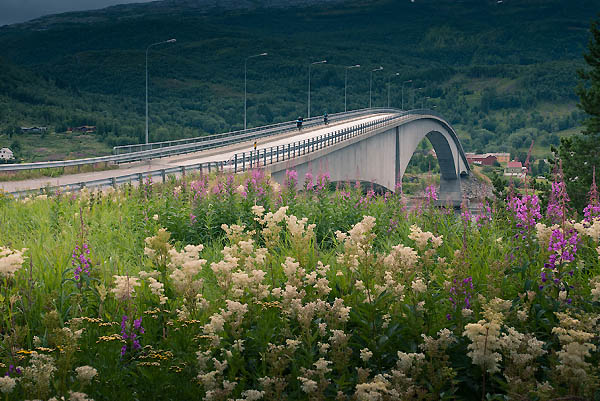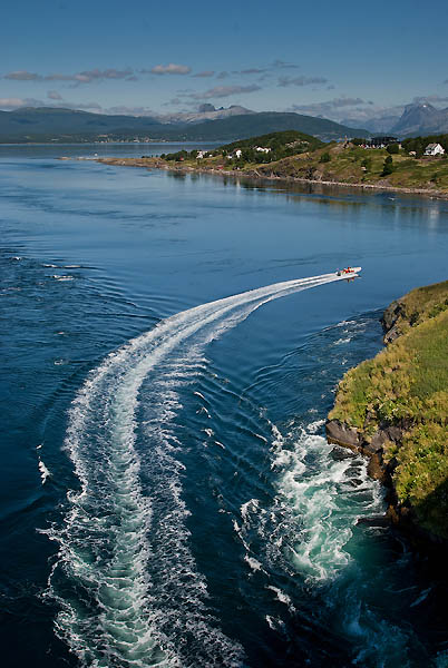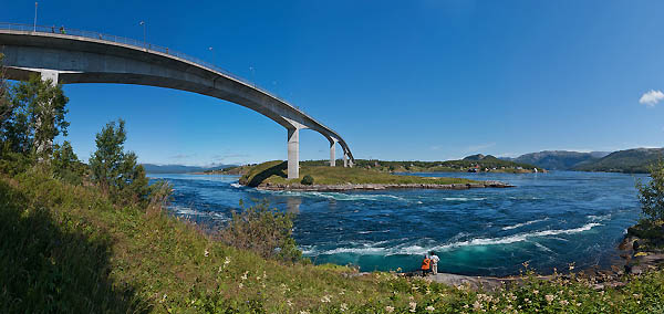 К полудню погода стала налаживаться. А может мы просто уехали от ненастья подальше… Мост через пролив Сальтстраумен - это узкий перешеек между фьордом и морем. О норвежских мостах можно говорить отдельно - они все очень похожи, и все сливаются с природой в одно целое. Через перешеек между фьордами протекают миллионы тонн морской воды в день во время приливов-отливов. Мы как раз застали прилив: посмотрите, как бурлит вода!