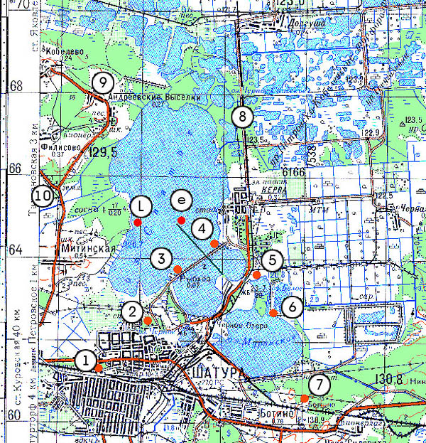 Этот рассказ и посвящен моим любимым местам. Но, рассказывая о них, мне очень хочется, что если вы будете там хоть раз – берегите природу, мне бывает очень больно, когда я вижу летом людей, так нагло и бездушно обращающихся с Шатурой. Летом вокруг озёр образуются горы мусора, озёра застраиваются стенами, деревья срубаются, всё в округе обрастает заводами, трубами. Честно – места эти нужно включать в заповедник, природа тут совершенно уникальная. И чего только стоит то чувство, когда журавль вспархивает в небо в тихой заводи озера – и сердце замирает от восторга, от переполняющей тебя радости! А опустить руку в прохладную коричневую, красную в лучиках солнца торфяную воду в палящий жаром день со старенькой лодки… Так, опять я отвлёкся на воспоминания и на солнечные мысли. Наверное, солнце во мне уже растопило зиму. Для удобства я отметил все интересные места около Шатуры на карте. Карта слабой детализации, но вы найдёте, если захотите ;)