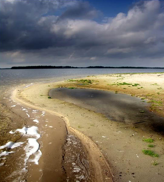 На середине косы вы можете свернуть налево или направо на перпендикулярную косу. Так озёра Шатуры хотели разделить на части. Идиоты. Зачем это было сделано – я не знаю, но помню эти ужасные трубы, которые намывали песок, разрывая одно большое озеро на части. И зачем? Озеро ведь так зацветёт, погибнет, превратится в болото… Хорошо, что не разделили – вы можете пройти на край косы и поваляться посреди озера на самом кончике песчаной отмели (отметка на карте - е). Это и сейчас очень уединённое место.