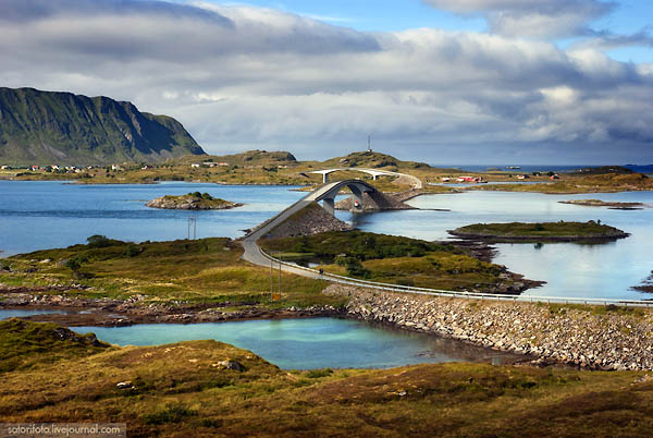 Мосты Норвегии удивительны: с широкими пролётами, массивные, но в то же время выглядящее очень легко - они лежат между фьордами, заводями. Это, конечно, не знаменитый Стортезандский мост, уходящий в небо, но тоже красив. В этом месте мне запомнился интересный случай, который произошёл с моим другом, Димкой на этой развилке. Мы немного проскочили вперёд, а он нас догонял - и уехал не туда (как раз в сторону этого моста: видимо, пейзаж ему понравился). И мне с горы осталось лишь наблюдать, как моя группа едет в одну сторону, а Димка - в другую. Ну ничего, Саша потом "втопил" - догнал Диму…