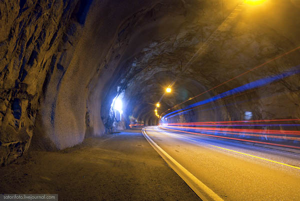 По протяженности тоннелей Норвегия бьёт все рекорды. Cамым длинным автодорожным тоннелем в мире считается норвежский горный тоннель Laerdal (24,5 км.), являющийся частью скоростной дороги, соединяющей столицу Норвегии Осло и западный порт страны Берген. Честно говоря, ощущения те ещё, когда въезжаешь в подводный тоннель: едешь минут 15 вниз, не нажимая педальки с одной лишь мыслью - сколько же потом крутить наверх! А внизу здорово: мокрые стены, капли капают с потолка. Шумят камни о стенки тоннеля… Некоторые - не вентелируются (даже по 3-5 км!). И явно чувствуешь нехватку кислорода.