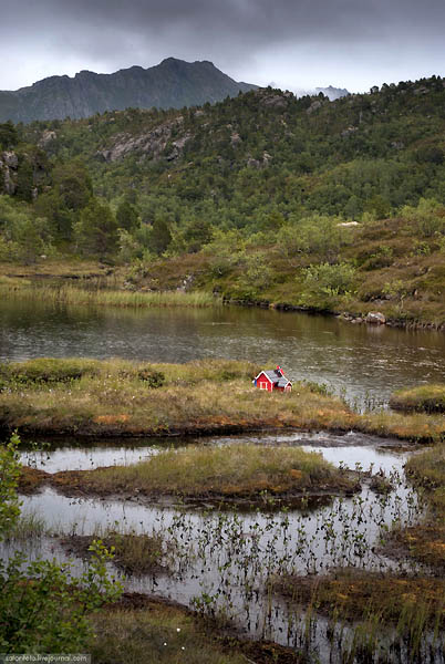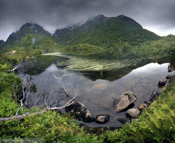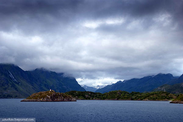 Да и в серый денёк можно снять что-то необычное. Например, вот такую большую панораму обычного озера. День заканчивается. Не богат на "улов", а просто приятен. Снова паром, фьорды, маяки, горы… На ночь встаём прямо около берега, чуть-чуть поднявшись от паромной станции. С видом на фьорд.