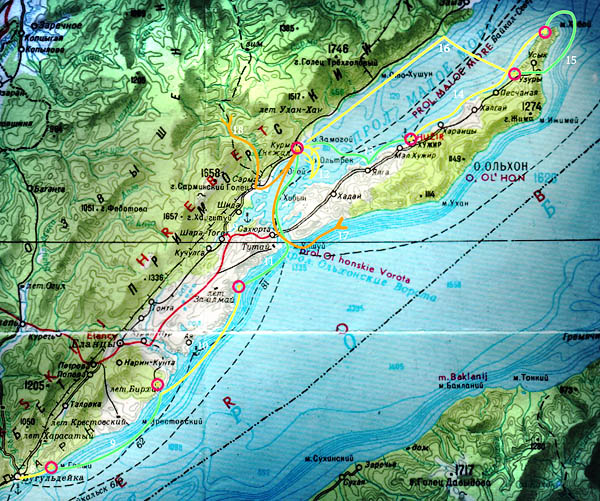 Пообедали. Жизнь прекрасна. Довольные сытые шарики выкатились на лёд. Такая красота - хоть никуда не иди. Ползаем по льду, лапаем сосульки и льдинки как дети. Развалились на льду и смотрим на пузырьки, трещинки, бирюзу прибрежного льда. Картина: 5 человек ползают по льду, размахивая лапами, бегая туда сюда и шлёпаясь с непривычки на лёд, крича друг другу восторженные фразы. Ну что тут могли подумать местные рыбаки? Ну ничего, привыкли. Встали на коньки, попробовали - катится замечательно, можно хоть педали почти не крутить - само несёт. Тут же придумали конструкцию, как закрепить саночки верёвкой на пояс. В добрый путь!
