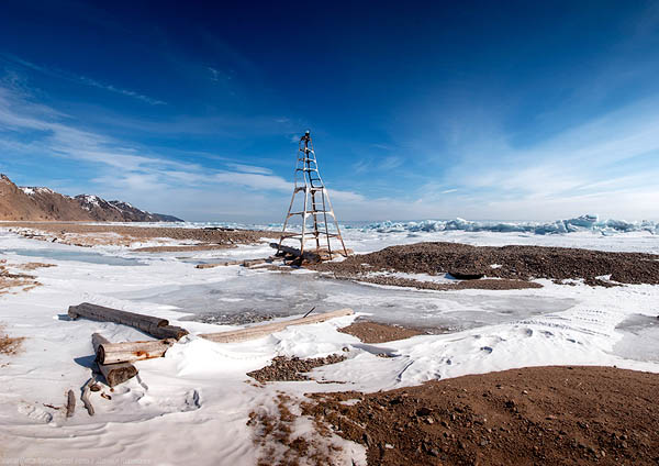 Ну что ж, мы приехали! Вот он уже виден - кусочек мечты, за поворотом. Пытаюсь купить воду для обеда в магазине - нету, есть только газированная. Тётя в магазине явно позабавилась моему вопросу о воде. Ну что ж, обед-то готовить как-то надо. Хотели по-быстрому, чтобы лёд не топить. Вышли на берег Байкала. Лепота! Но пока как-то страшно выходить, это как в открытый космос первый раз выйти. Но когда-то это должно было случиться - вышли, походили немного по льду. Впечатления самые необыкновенные, восторг. На берегу - большие глыбы белых камней. Видимо, мрамор. Бугульдейка раньше была рабочим посёлком для перевозки плотов из леса по Байкалу, и был тут мраморный карьер. И аэродром тут раньше был. А сейчас как-то всё загибается, много брошенных домов. Продолжаю поиски воды. Подошёл к участку, где мужик напористо пытался снести сарай-туалет ловкими движениями. Попросил воды принести. На довольную усатую улыбку и фразу "А там чё - нету?" (с указанием в сторону самого большого запаса пресноводной воды в мире) я ничего кроме тупой улыбки в ответ сказать не смог. Мужик, впрочем, не сопротивлялся - и воду принёс.