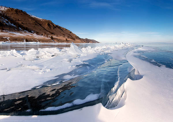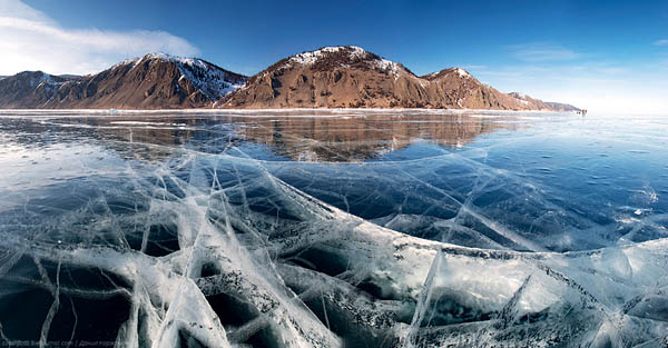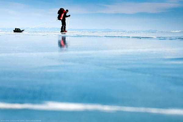 Как и показывали космоснимки, лёд - чистейший. Просто огромный каток. Просматриваются хорошо белые сопки Баргузинского хребта на другом берегу. Рюкзак как-то болтается себе спокойно сзади по льду, совсем не напрягает и не тянет назад. День получается коротким: надо успеть до зимовья, а уже вечереет. Слишком долго возились с ледышками.