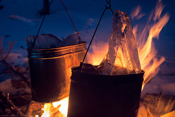 Чтобы попасть с берега на озеро приходится перебираться через груду торосов на берегу. Льдинки мелкие легко и звонко раскалываются. Копаться среди торосов ночью - весёлое занятие. Такое ощущение, что непрошеный посетитель забрёл случайно на кладбище битых бутылок и устроил там дебош. Как-то стыдно будить так Байкал… Пойду-ка я поем и спать.