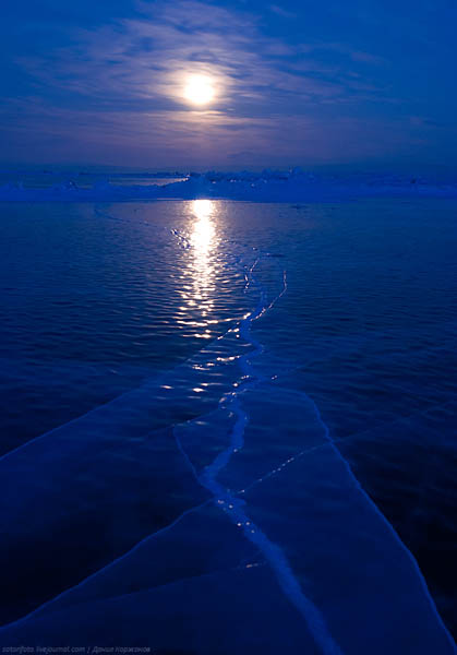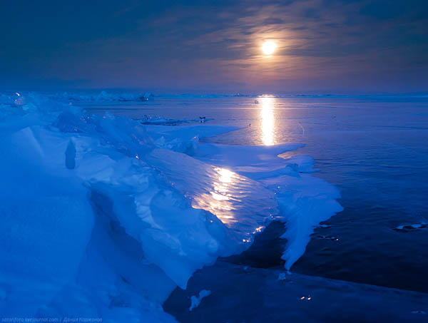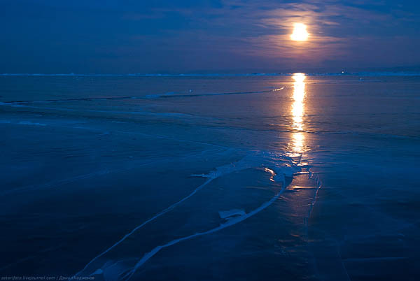 Вот и ночь наступила. Удивился, как вышла полная луна. Кажется, что перед тобой - целое море, в котором плещется вода, отражаясь мелкой лунной рябью. Пошёл погулять на ночной лёд, оставив своих друзей готовить еду у костра. Байкал скрипит, ухает, разговаривает во сне. От резких звуков, тресков и бульканий сначала вздрагиваешь, а потом привыкаешь. Чувствуется сила, мощь озера. Оно живёт, сопротивляется оковам льда. Наверху в небесной тишине - звёзды, впереди - луна, под ногами - чёрнота прозрачного льда, там уже толща воды. Натуральный космос!