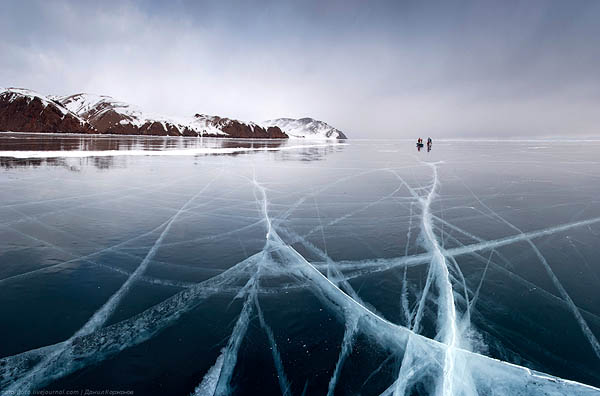 Хмарь никуда не делась с вечера. Движение - это жизнь, согреваемся на коньках. Это с утра я расстроился такой погоде, а к обеду (а тем более - потом) уже понял, что тучи над Байкалом - настоящий подарок фотографу. Лёд тихо замирает, тучи пролетают на низкой высоте, перекрывая солнце - и мы, одинокие человечки, катим по диким местам Байкала.