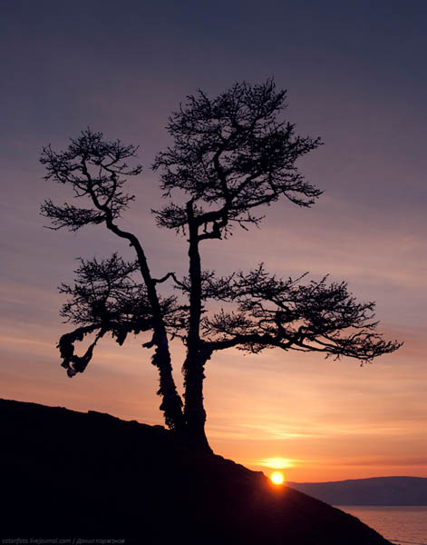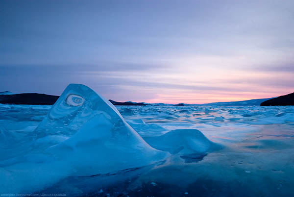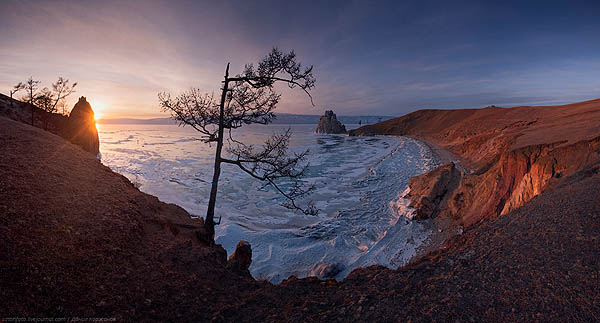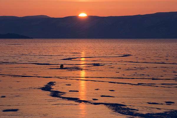 Солнышко медленно садится за горы, а по льду внизу бегают-суетятся фотографы. Золото разливается по льду Байкала. Медленно появляются новые краски: фиолетовый, синий оттенок ночи.