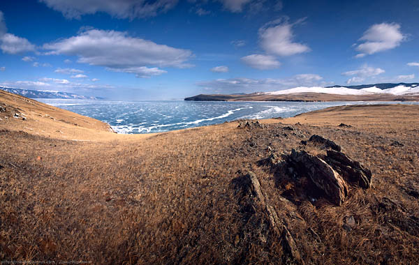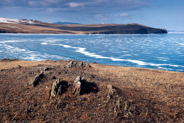 Сегодня в программе - переход до мыса Елгай острова Ольхон (от бурятского елгай - "овражий", елга - "овраг"). Идём от Ольтрека через Замогой. Погода опять хорошая, честно говоря, это начинает раздражать: светит яркое солнце, слепит в глаза ото льда. Да и фотографии хорошие можно сделать только в погоду с тучками. Останавливаемся пообедать у острова Замогой, который поражает своими неприступными скальными стенками. Сидим мы спокойно, готовимся к принятию пищи. И тут - нарастающее уханье и треск с другой стороны Озера. Звук молнией доходит до нас, лёд трясётся, трещит натужно. Мы вскакиваем с мест как потревоженные суслики, озираемся. Фух, вроде пронесло, звук ушёл дальше. Балует Байкал, силу свою показывает. Суслики - в норку пообедать. Встаём - едем дальше. Вскоре путь преграждает свежая широкая трещина: видимо, после землетрясения открылась. Трещину не переходим: держим путь в Елгайский залив. Дошли довольно быстро до берега Ольхона.