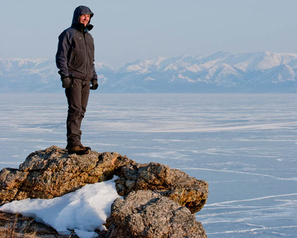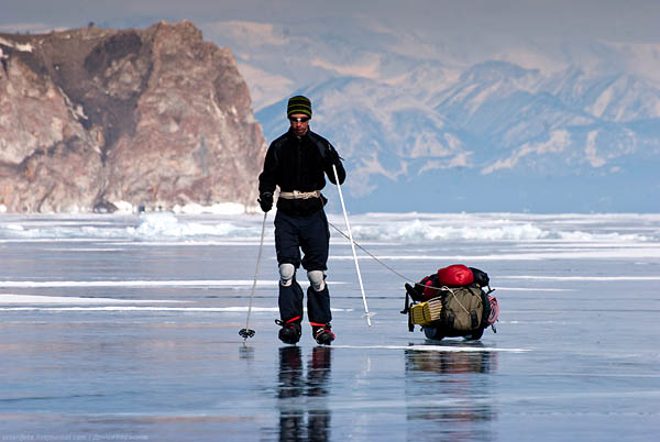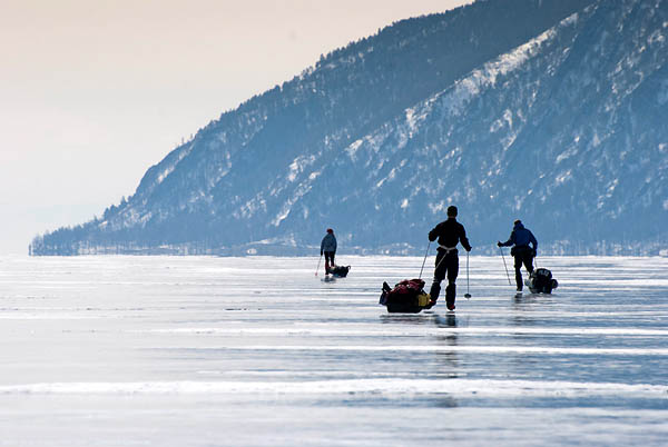 Впереди - только далекий-далекий противоположный берег Байкала. У нас возникала мысль пройти Озеро поперек, дойдя до Ушканьих. Но слухи о множестве трещин, о суровых ветрах побороли эту слегка безумную идею. Поэтому мы обогнём Ольхон и пойдём по восточному берегу.