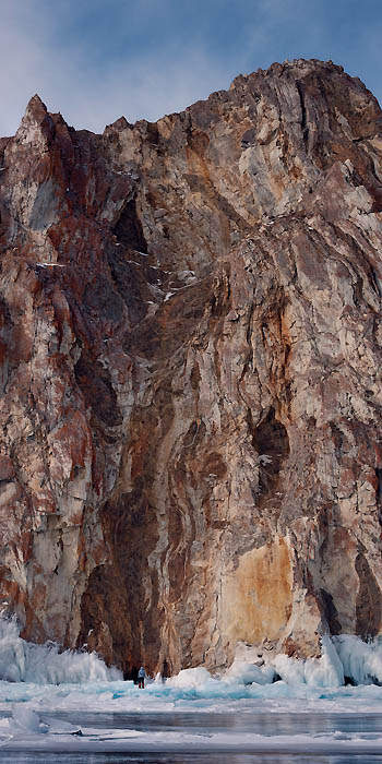 И вот - мы уже идём вдоль Восточного берега Ольхона. Кажется, далеко мы и не ушли, а природа сильно поменялась: и лёд другой, и скалы как спички стоят, вытянувшись ввысь. Идти легче: из рюкзаков всё повыедали, и лёд после поля торосов кажется сам подталкивает вперед.