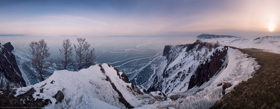 Смотрим наш путь на завтра. Лёд везде чистый, без снега. Видны Ушканьи острова на горизонте и гигантские трещины-разломы. Спускаемся, разводим костёр в небольшой пещерке-распадке. Хорошо стало: опять пришло чувство отсоединения от цивилизации. Костёр языками пламени бросает крупные отсветы на нависшую скалу, рядом - гигантская чаша Байкала и мелькают на горизонте светлячки-фары машин. Успеваем пофотографироваться на вершине. Вид изумительный с верха!