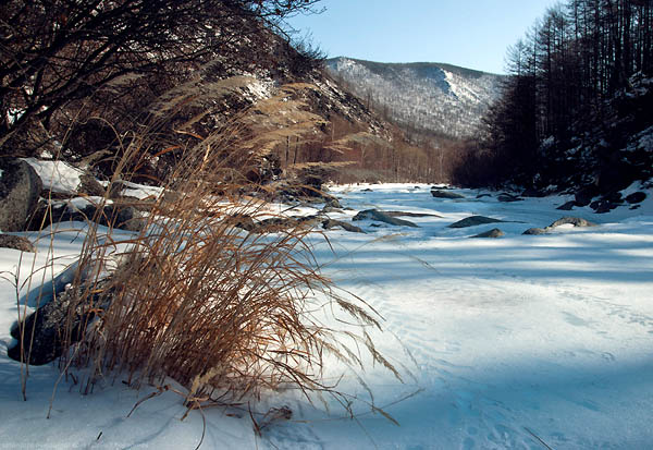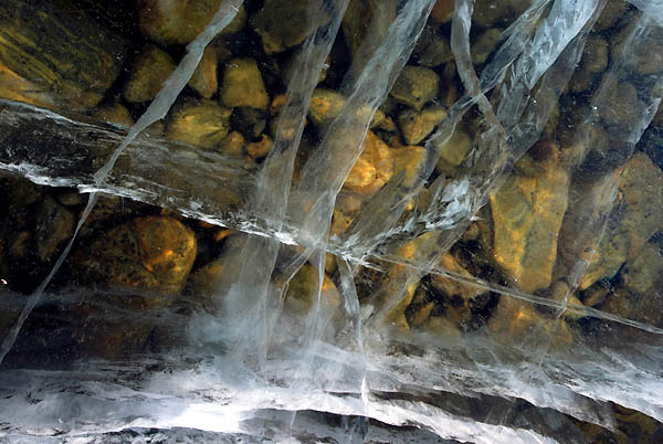 Зато как было красиво спускаться вниз по реке на коньках! Летишь по лазури льда в разные рукава реки, мимо пролетают деревья, кусты, скалы. Под мостом даже проехали. И тут - опять встречаем Юру. Он нас ждёт уже со вкусными бутербродами. После таких встреч очень хочется так же открыто дарить добро людям. Скоро мы уже внизу, скатились к заводям Байкала. Озеро напоследок подарил нам ещё один момент счастья и красоты - такой спуск. У Байкала уже опять стоит Юра, уже со своей хондой-малюткой, нас всречает.