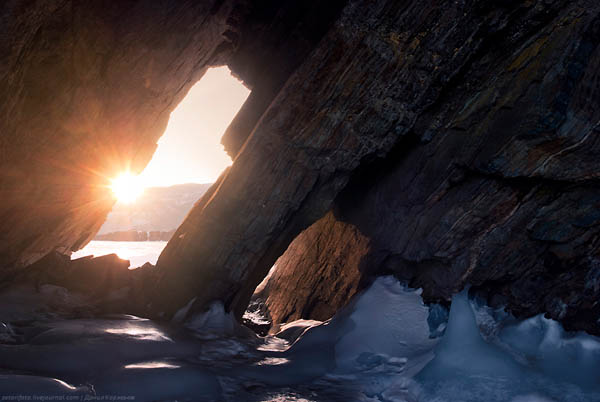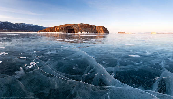 Возвращаемся домой, в Ольтрек по вечернему Байкалу. Снова красивые гроты Уюга,.. бирюзовый лёд и острова Малого Моря. Закатное солнце уплывает за горизонт.