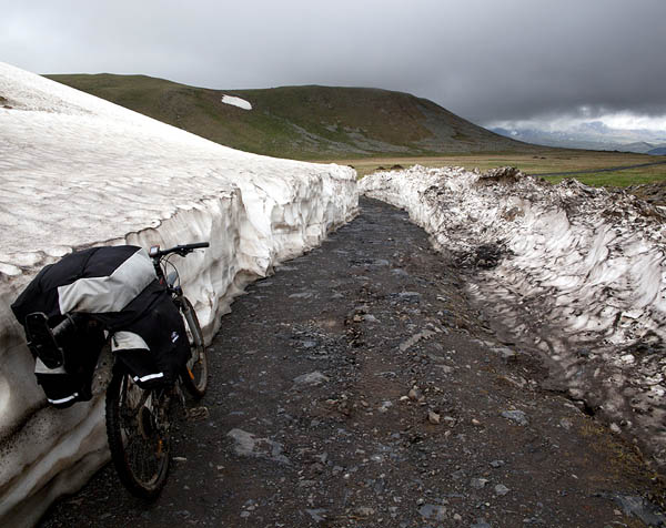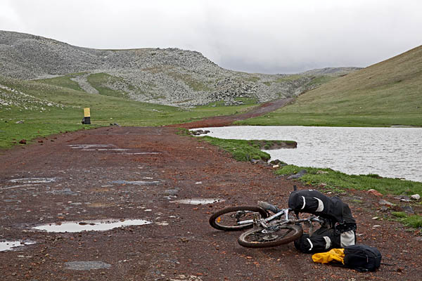 Плохая видимость, мокрая одежда, крики птиц, гнездящихся в соседних камышах, раздолбанная дорога и, в конце концов, прекрасный перевал. Было настолько красиво, что я километров 15 шла рядом с велосипедом и поминутно лазила за фотоаппаратом.