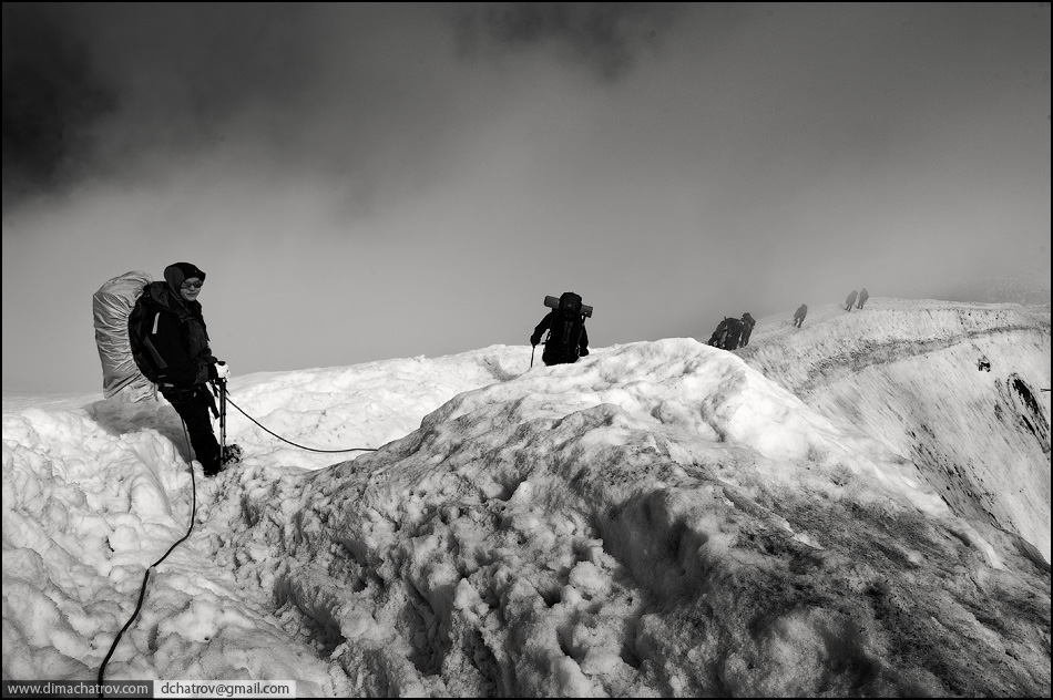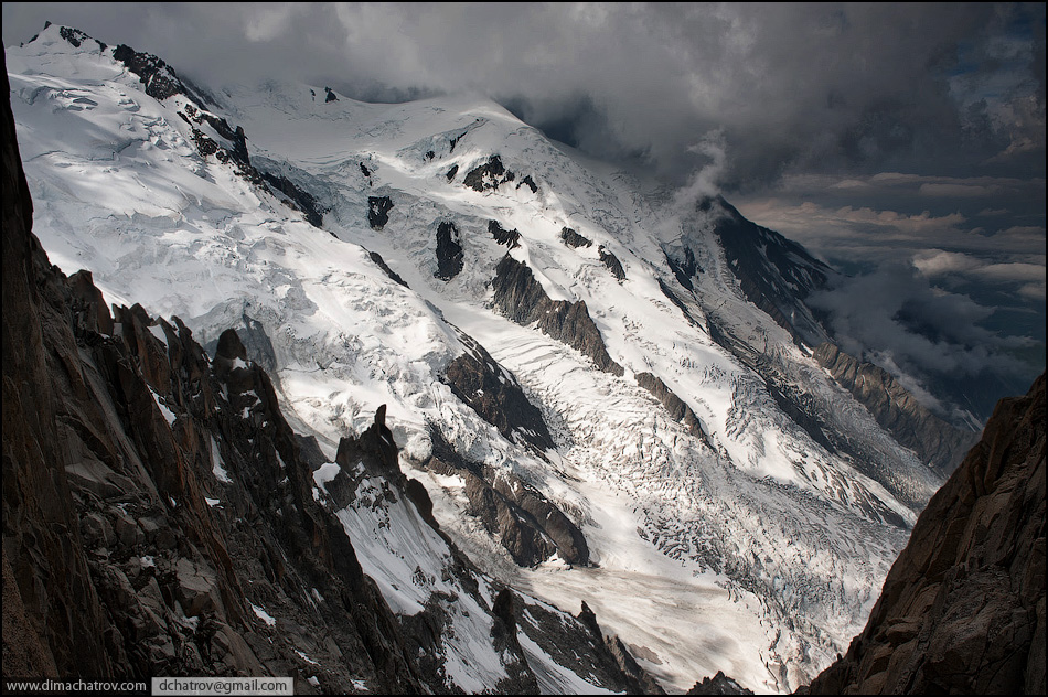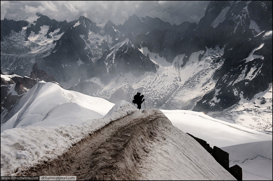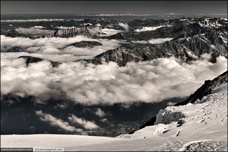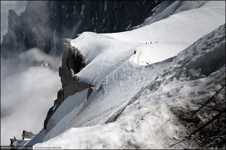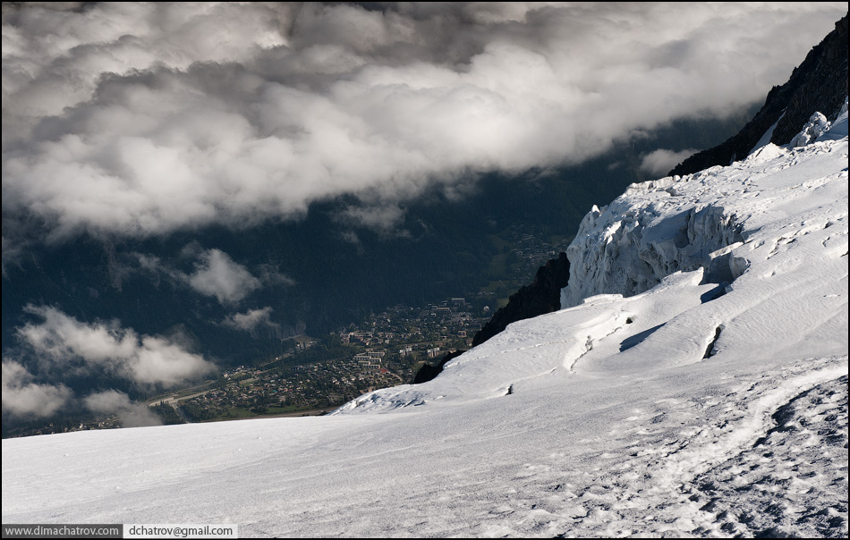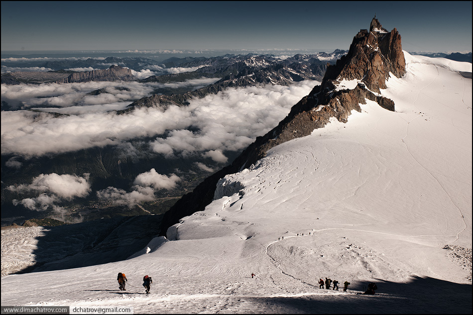 День второй. Вид на долину Шамони со склонов Mont-Blanc du Tacul. Точка съемки примерно 3700 метров. Ночь мы провели в Белой Долине (Valee Blanche), и парой часов ранее стартовали из точки напротив скального выступа в правом верхнем углу кадра. На большем размере видно, как причудливо петляет тропа, обходя забитые снегом трещины и выбирая наиболее пологие участки подъема. Все восхождения традиционно начинаются очень рано. Утренний мороз сковывает трещины и укрепляет снег, обеспечивая проход по плотной, хорошо набитой тропе. К обеду снег раскисает, набивается в кошки, из-за чего кажется, что на каждой ноге висит по бетонной отливке. Подъем в горах - это своего рода медитация. Очень важно выбрать правильный темп, втянуться в него и по возможности не сбиваться. В этом плане работа фотографа - штука коварная. Всякий раз, когда нужно остановиться, выбрать ракурс и сделать кадр, вам приходится начинать подъем заново, теряя лишние силы на возобновление ритма. К тому же, очень обидно наблюдать группу, ушедшую за это время на полсотни метров вперед :)