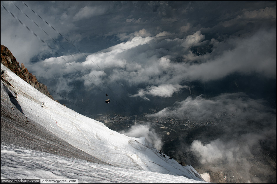 Такой вид открывается со смотровой точки любому желающему, кто не пожалеет 26 евро и не побоится подняться на подъемнике из теплого Шамони на продуваемую со всех сторон площадку Aguille du Midi. Если вы все-таки рискнули, имейте в виду, что на этой высоте даже летом температура редко поднимается выше десяти градусов. За какие-то двадцать минут подъемник доставит вас из жаркого туристического лета в холодную альпийскую зиму. Очень забавно наблюдать японских туристов, шумной гурьбой высыпающих из вагончика. Первые несколько минут они восхищенно щелкают своими "мыльницами" направо и налево, а потом с повизгиваниями устремляются греться в закрытый ресторан, специально выстроенный на вершине.