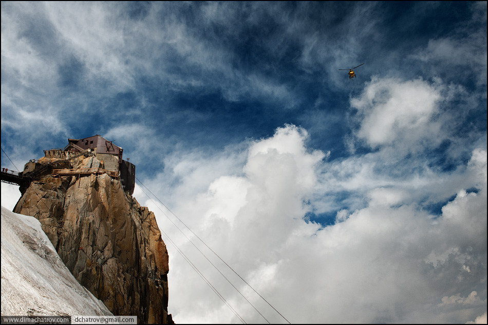 Aguille du Midi - место уникальное. Снимаю шляпу перед мастерством инженеров, умудрившихся возвести целый жилой комплекс в отвесной игле на высоте без малого четыре тысячи метров. В том году я уже показывал вид на эту постройку. Кстати, вертолеты кружат над Альпами все время. Это и коммерческие вертушки, и машины спасателей. Порой на ледниках только их присутствие и говорит о том, что вы в цивилизации... Выход на маршрут прозаичен. От туристов тропу отделяет только крохотная калитка с символическим запором. Все правильно, если у кого мозгов нет и захочется геройства - тогда и замок не спасет: два шага в сторону, и перед тобой откроется пропасть.
