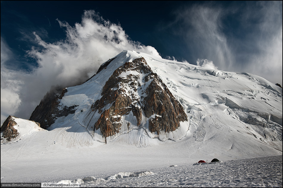 На первых минутах это не тропа даже, а настоящая колея. Эдакий горный час-пик. В первый день нам предстоит совсем мало работы. Для "нового" человека подъем с 1400 метров до 3800 - вещь далеко не самая гуманная. В висках стучит, дыхание учащенное. Если остаться на этой высоте более чем на три-четыре часа, то придет "горняжка", а потому наша задача - спуститься в долину метров на 400 ниже и встать лагерем. Акклиматизационный выход и легкая физическая нагрузка - остальное организм сделает сам. Вечер первого дня. Эта изрытая трещинами махина - гора Mont-Blanc du Tacul (4248). С ее обратной стороны бушует непогода, накрывшая нас плотным слоем града не далее как за час до этого. Удивительно, первый раз попал под градины, оставляющие после себя синяки… Поток альпинистов иссяк. То ли непогода погнала всех в Шамони, то ли прямой маршрут в самом деле не пользуется такой популярностью, но к закату кроме нас в долине стояло всего две палатки.
