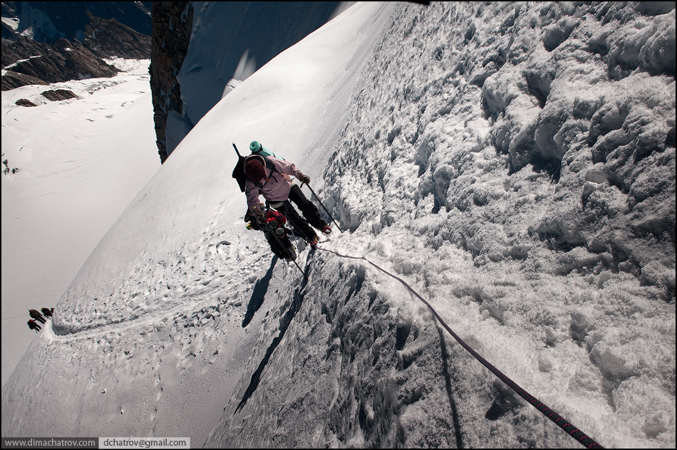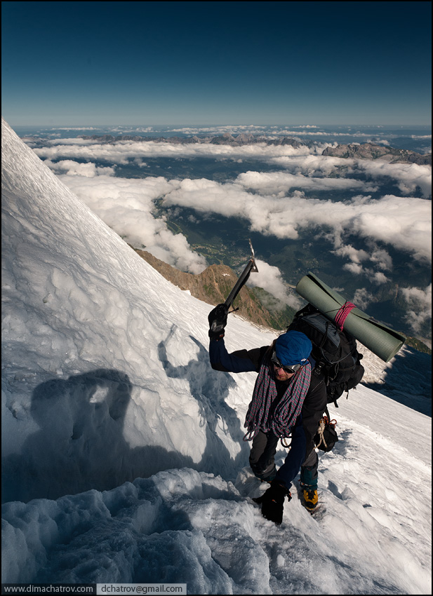 На первых порах окружающие красоты настолько захватывают дух, что вы буквально повизгиваете от восторга. Но эйфория быстро проходит, и через час-другой усталость и рваный ритм берут свое. Главное - это обязательно продолжать съемку, как бы плохо вы себя не ощущали. Отдых будет на привале :) Даже не верится, что внизу, в рваных облачных просветах, разлегся жаркий летний Шамони. Там обедают на залитых солнцем верандах и пьют ледяное пиво. И мало кто из них смотрит наверх... А еще иногда камера снимает сама. Болтаясь на плече, она время от времени бьется спусковой кнопкой о поясной ремень, так что в этом случае авторство кадра весьма условно. Но поскольку "система" с карабинами - это часть меня - нагло присваиваю права на него :) Примерно на полпути мы проходим терминатор и оказываемся в теневой части ледника. Угол наклона повышается, и тропа превращается в сорокаградусный подъем.