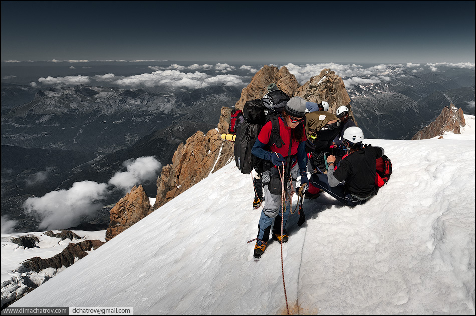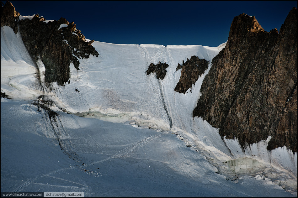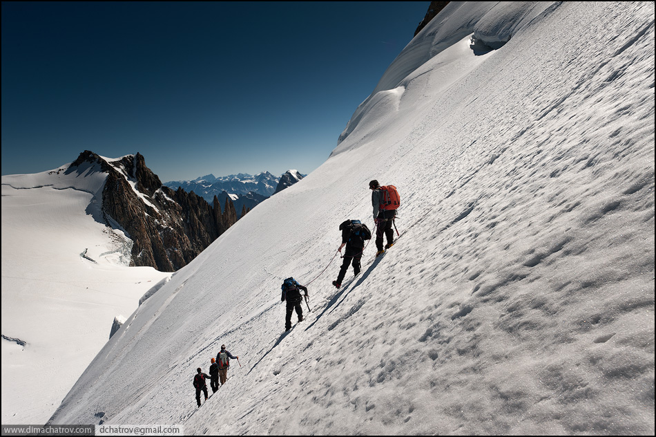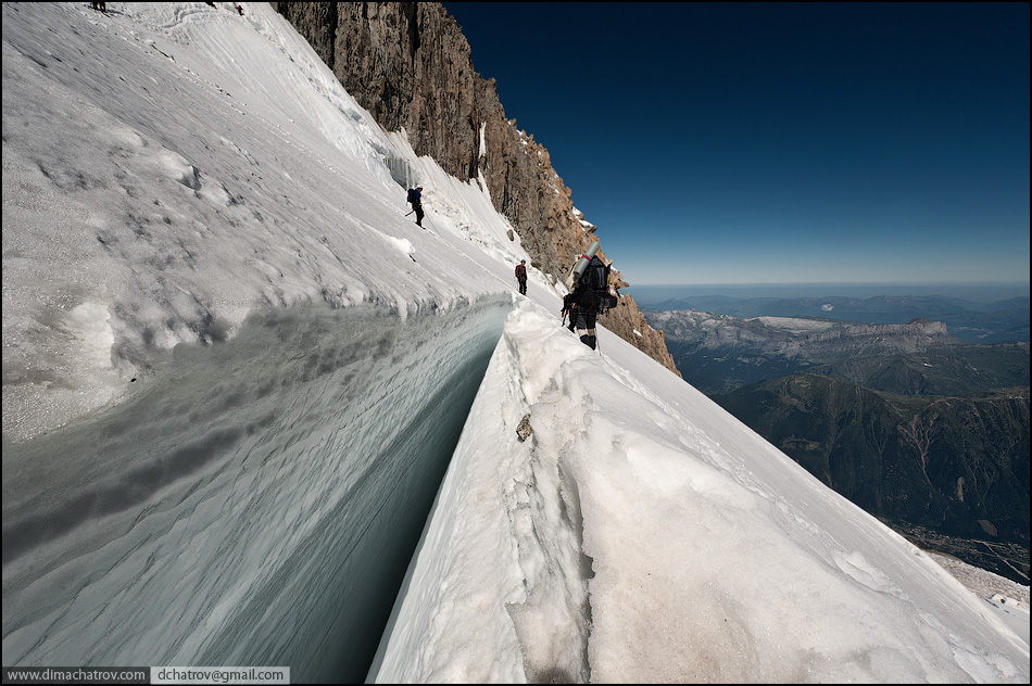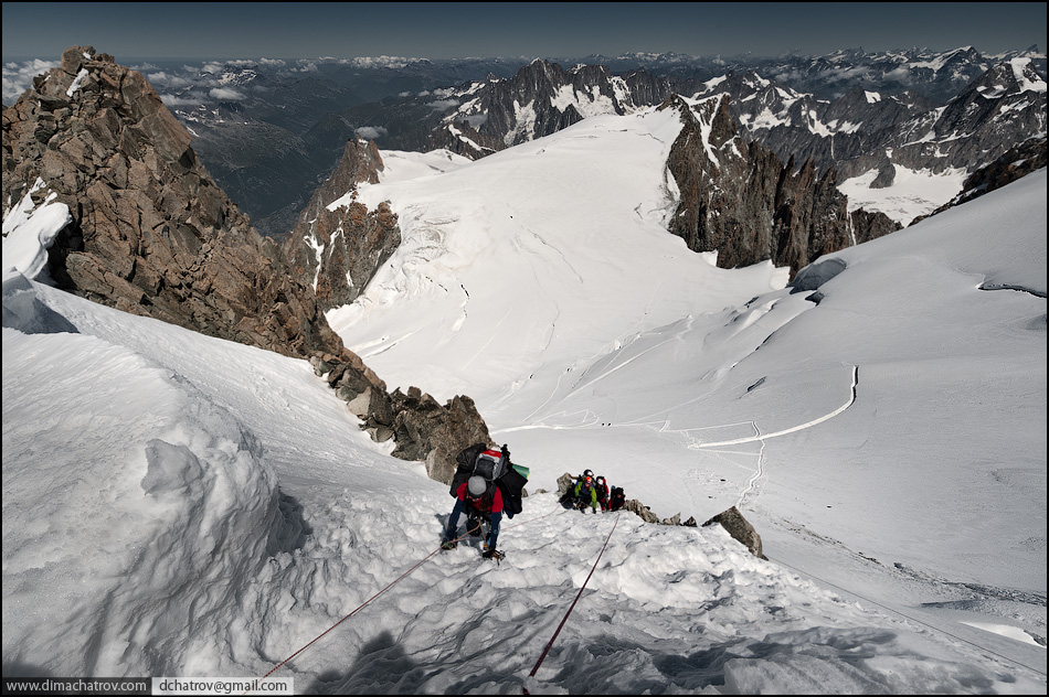 На траверсе открывается потрясающий вид на Монблан. Если повезет, завтра в ночь мы двинемся к вершине, а пока нам предстоит незначительная потеря высоты и спуск до перевала de la Brenva. Впереди появляется двойка усталых альпинистов. Они идут очень медленно и на приветствия не отвечают, а это в горах редкость. Видно, что подъем дался им не так легко. Спустя час мы спускаемся на отметку 4300 метров, к перевалу de la Brenva. Место ночевки ровное и гладкое, как попа младенца. Группа устала, но расслабляться нельзя: узкая ложбина ледника, окруженная скально-ледовыми стенами, грозит превратить перевал в маленькую аэродинамическую трубу, что уже было наглядно продемонстрировано минувшей ночью. И что делать? Зарываться в снег от самого главного врага - ветра.