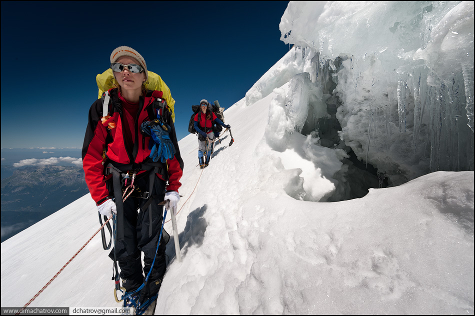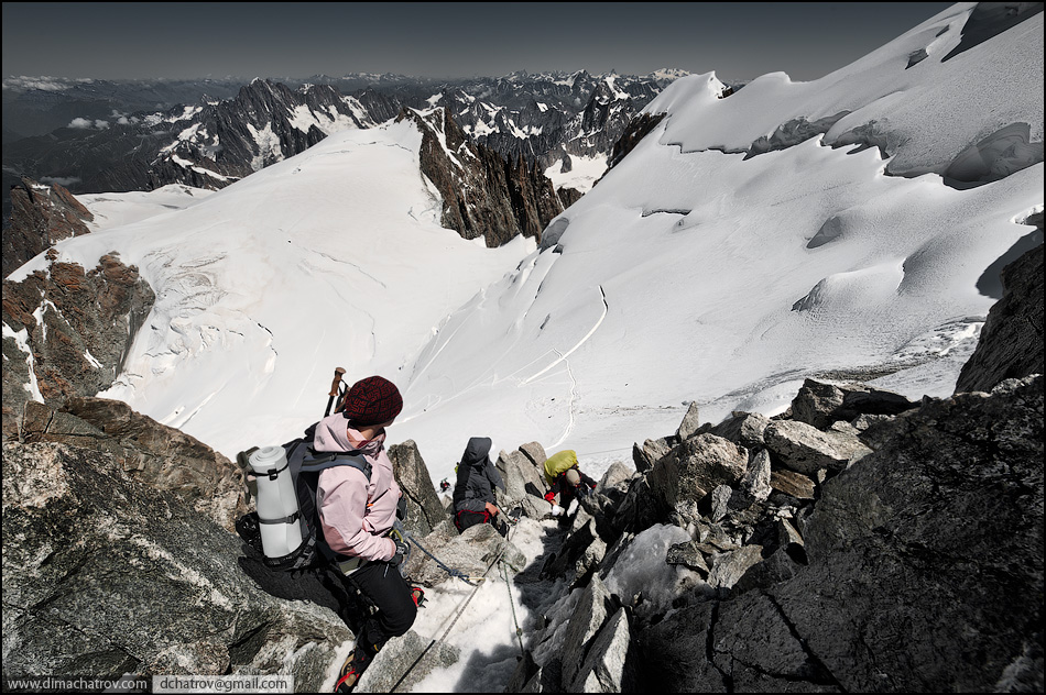 Подъем по снежно-ледовому кулуару к плечу вершины Maudit (4465). Увы, широкий угол охвата сцены не передает крутизну склона… Маршрут осложняется еще и то, что на этом участке постоянно работает несколько групп альпинистов, идущих в обоих направлениях. Два десятка человек в одном бутылочном горлышке - это перебор. Взлет пестрит множеством веревок разной степени старости и рваности. Полагаться на них, конечно же, нельзя. Более того, нужно внимательно следить за тем, чтобы перестегивать жумар только на свою веревку. Выход на перевал Maudit, даже не верится! Наконец-то можно глотнуть чаю и немного перевести дух. С перевала идёт траверс юго-западного склона горы Maudit.